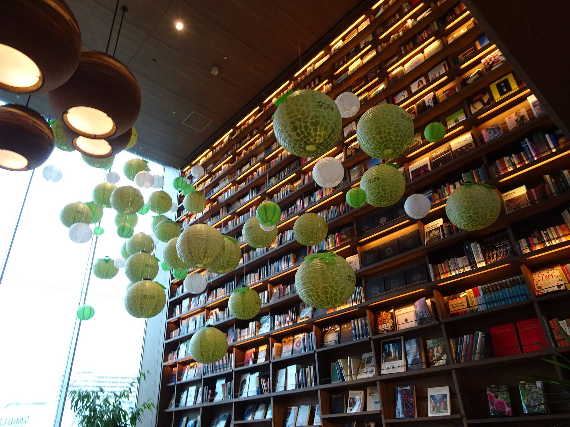 從京阪電車枚方車站下車走往T-SITE的聯絡橋,便可看到台灣觀光協會提供的100個2017年台灣燈會祈福燈「哈密瓜燈」,在TSUTAYA團隊的精心布置下成為書店內的最大亮點。兩面大型的落地窗,一面懸吊著高高低低、綠綠圓圓的哈密瓜燈,另一面則是整面書牆裝飾著聯想台灣九份的紅色燈籠,吸引了來往行人的目光。