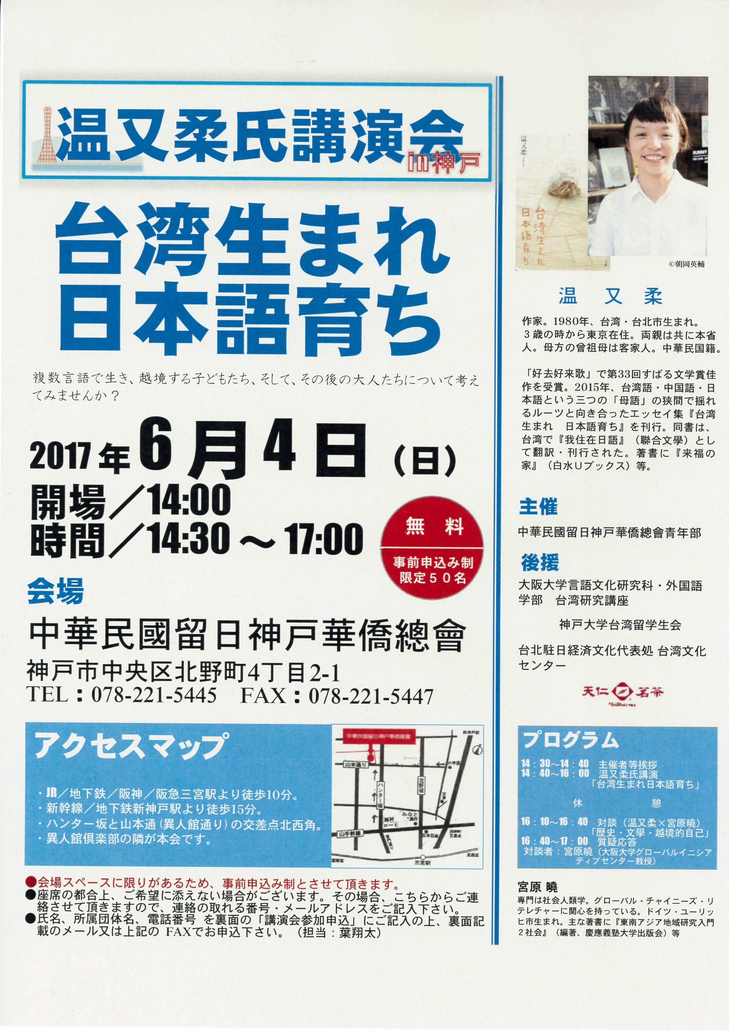 後援:大阪大学言語文化研究科・外国語学部(台湾研究講座)、神 戸大学台湾留学生会、台北駐日経済文化代表処台湾文化センター、 天仁茗茶
