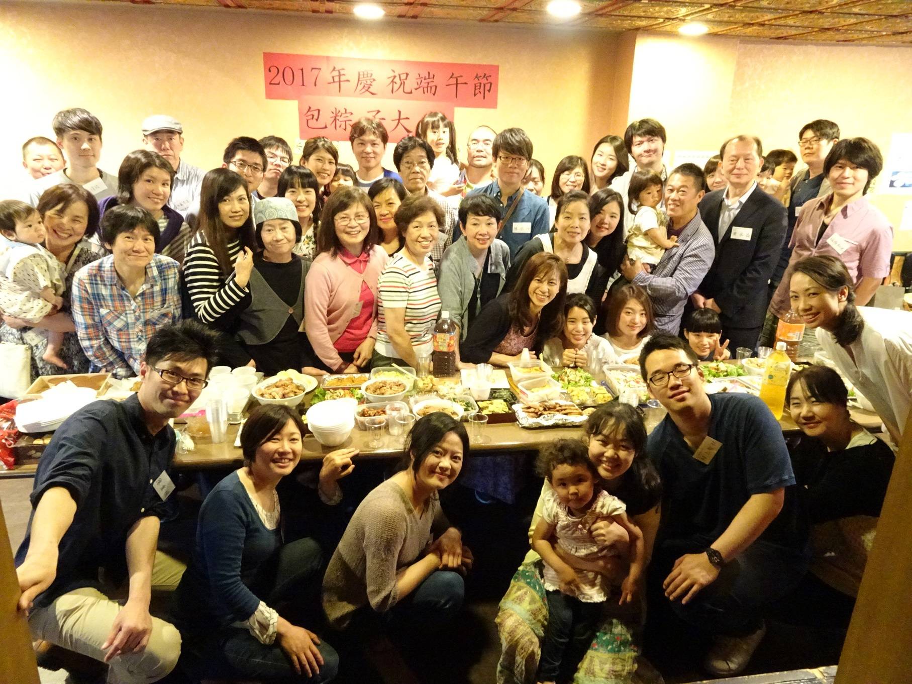 京都華僑總會在端午節前的周日舉辦包粽子大會,會員、留學生、日籍友人約50人齊聚理事吳華成經營的台灣料理「台北城」,提早歡度佳節。