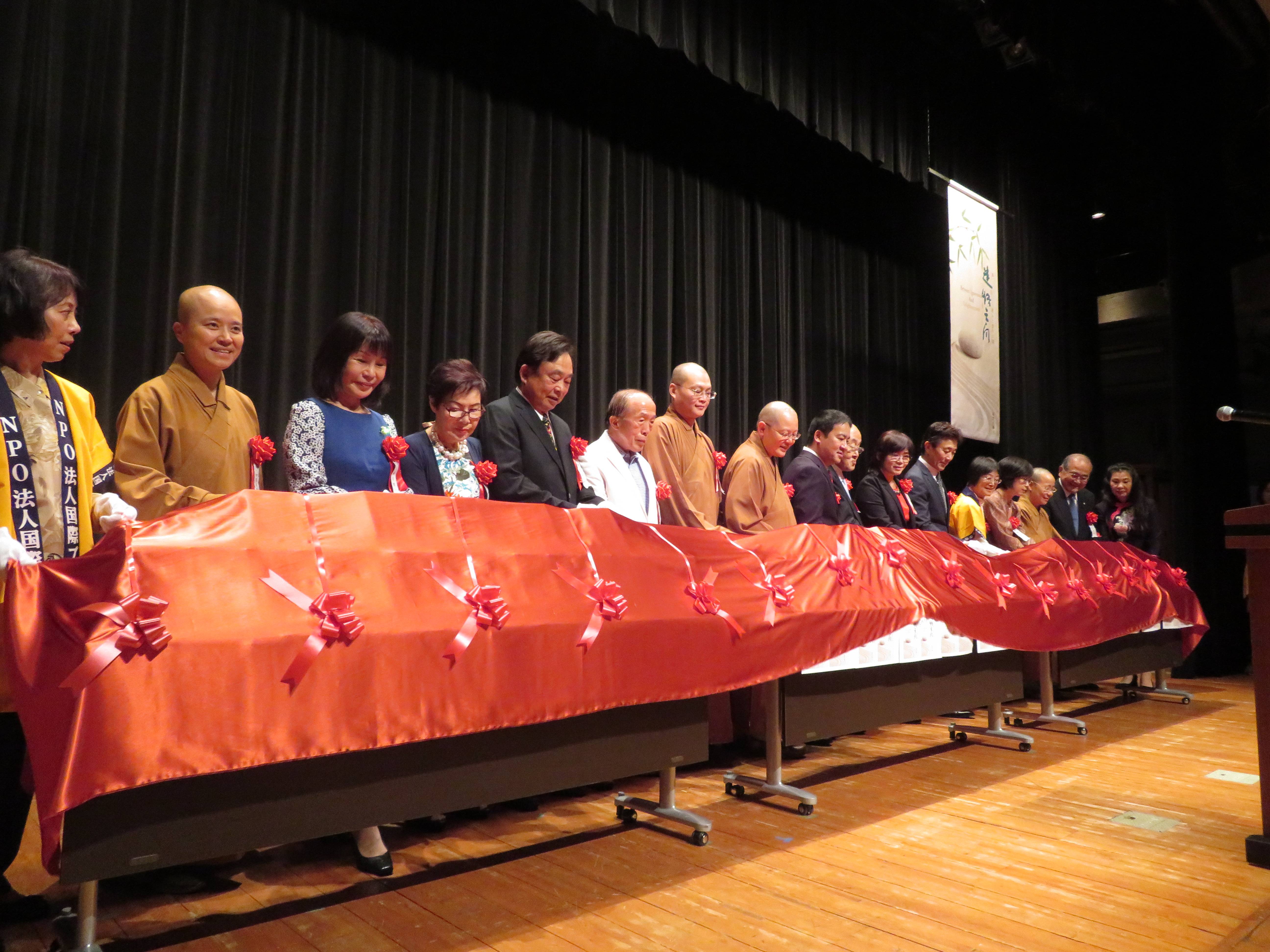 在開會式中,首先是NPO法人國際BLIA理事長滿潤法師說現在是秋天收穫的季節,興建五年的法水寺即將完工,在場各位一定也有許多努力得到了好的收穫。每年出席的長瀨議員也代表板橋區感謝每年的捐助與交流。NPO法人國際BLIA將今年一年信徒捐獻的善款贈呈給社會福利福祉法人板橋區社會福祉議會,佛光山幹部及僑界,板橋區日本貴賓共同上台,為星雲大師日文新書舉行發刊式。