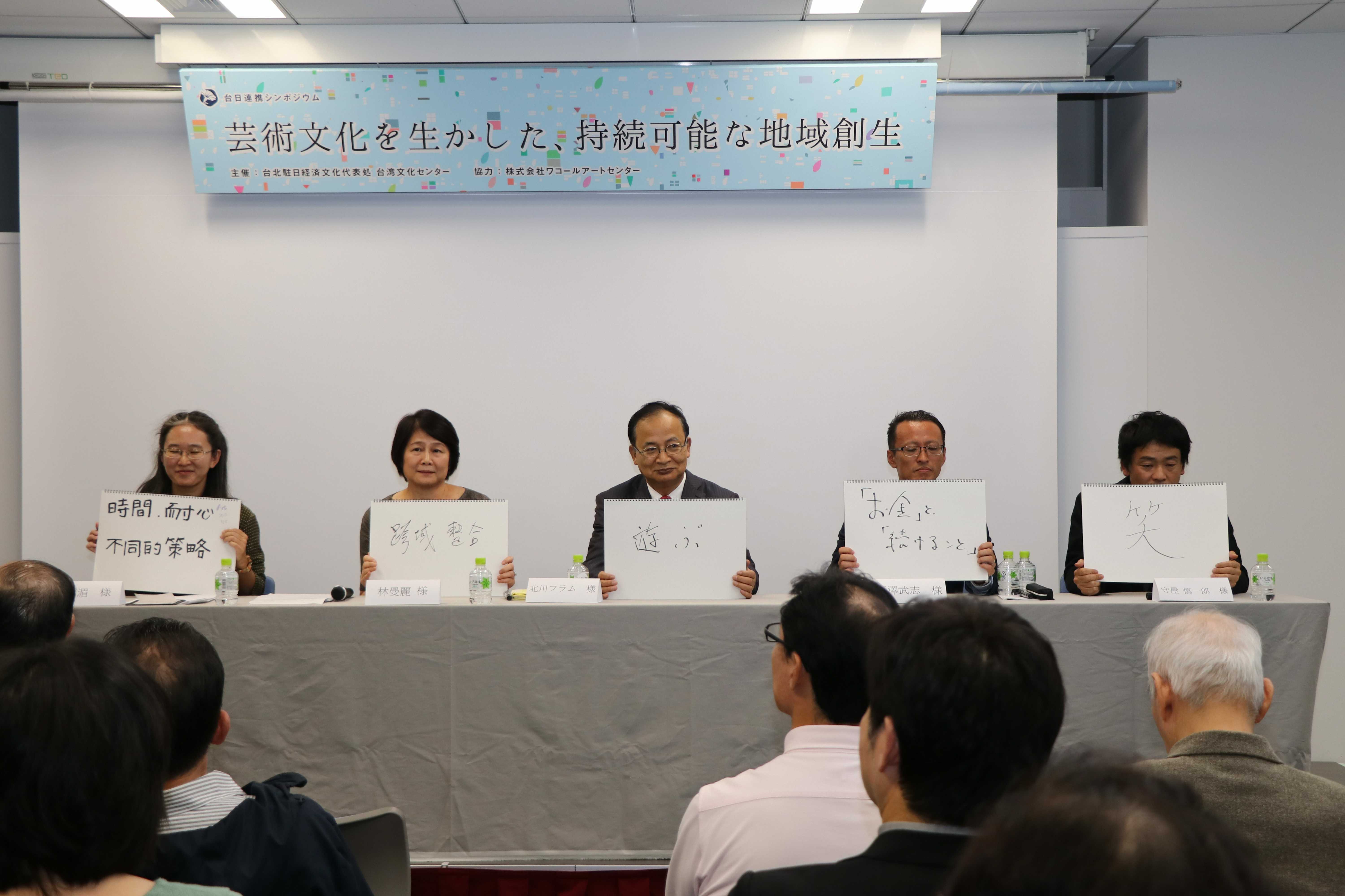 郭副代表也在代讀駐日代表謝長廷致詞稿中提到,台日文化交流藝術交流密切,日本的重要藝術祭如瀨戶內海三年展、大地藝術祭都有台灣藝術家參展,也有台灣縣市首長專程來日參觀。希望雙方透過這次的研討會,找到藝術造鎮計畫成功的關鍵,使台日文化藝術永續交流。