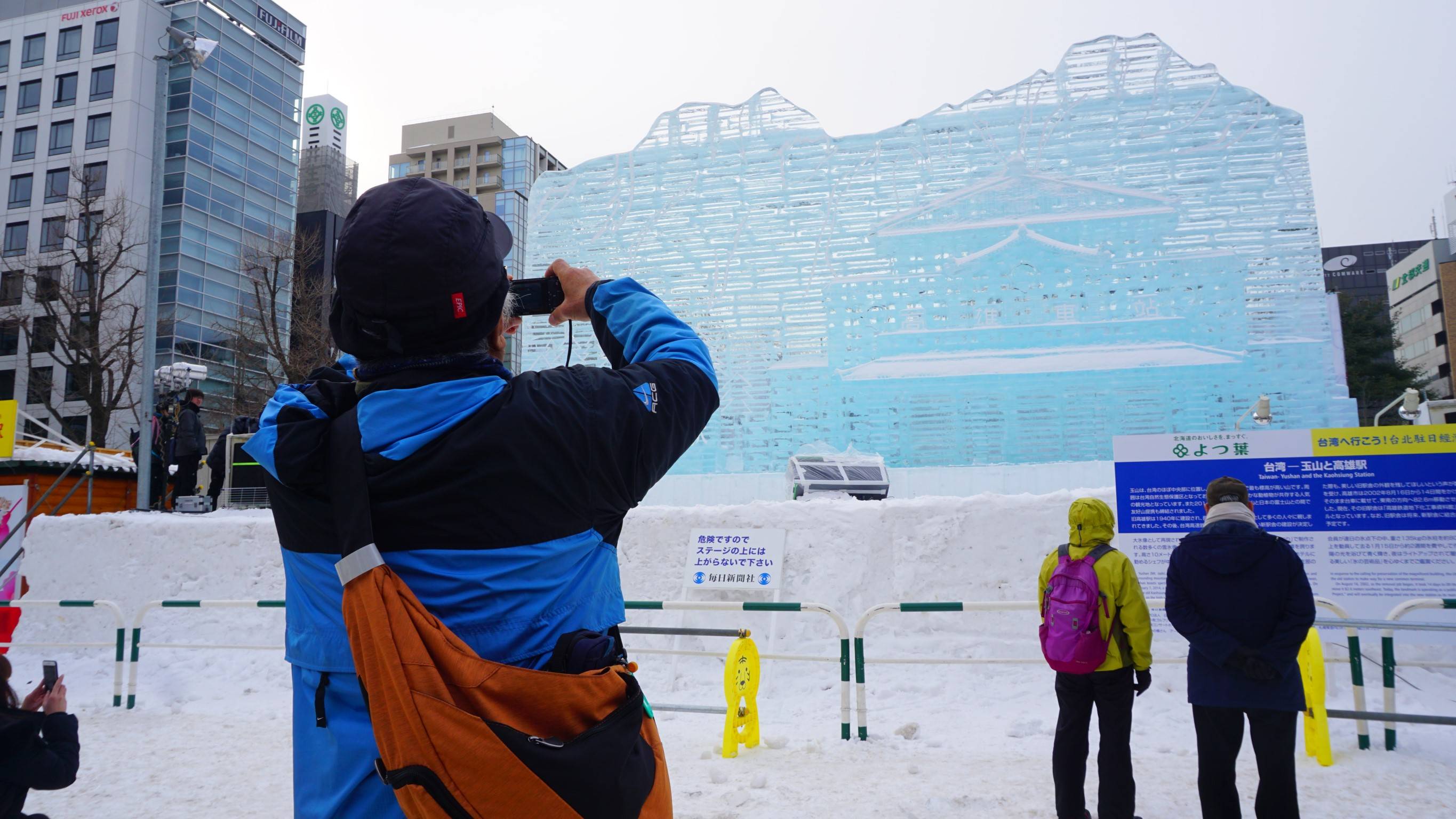 這次的「台灣-玉山與高雄車站」冰雕用800支冰雕製成,每支冰雕重達135公斤,而整體高10公尺、縱深16公尺、寬18公尺,打造出標高3952公尺和1940年所興建的高雄車站,除了介紹到2014年玉山與富士山締結友好山外,也特別提到2002年高雄車站的遷移,讓日本民眾能更進一步認識台灣。