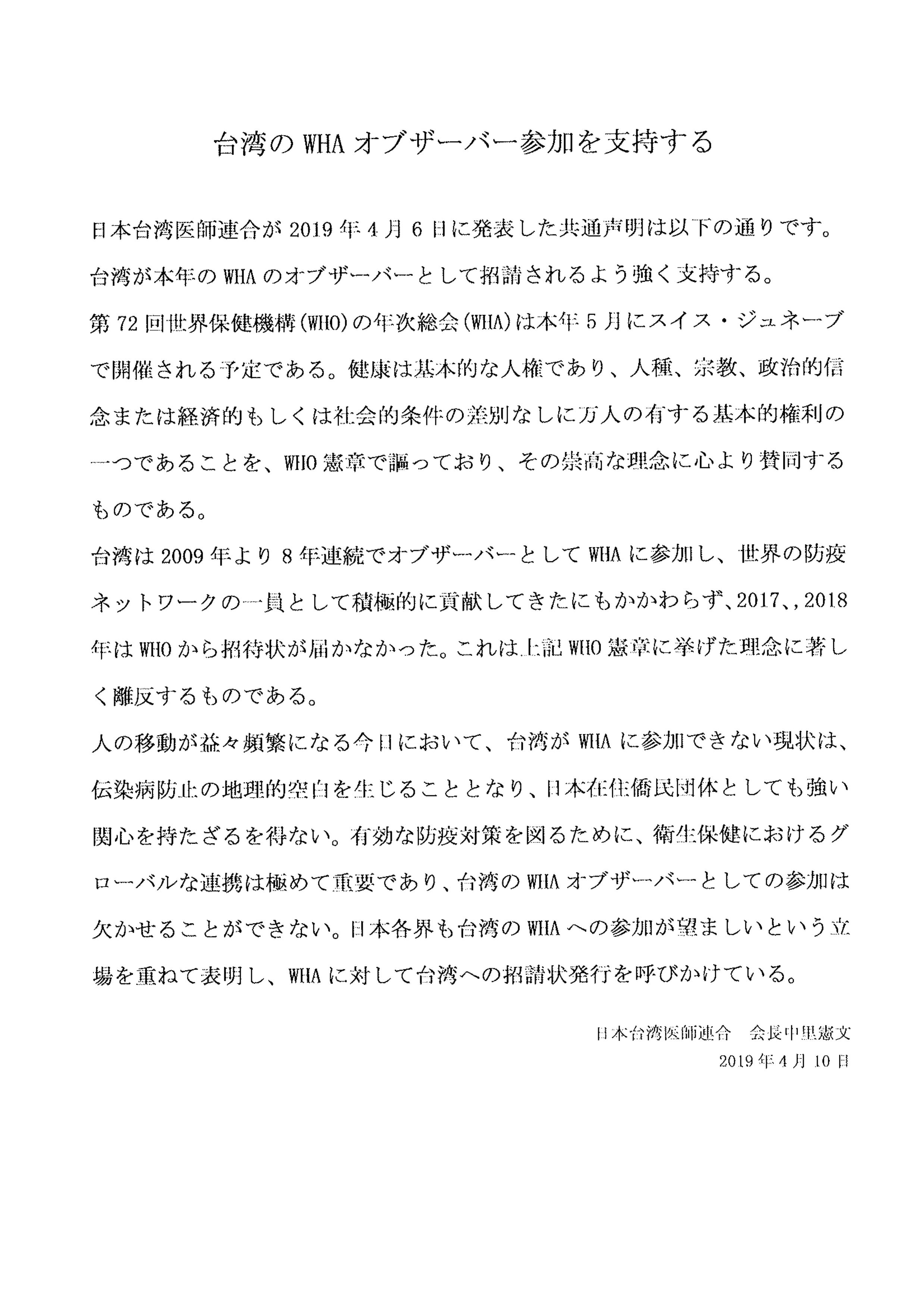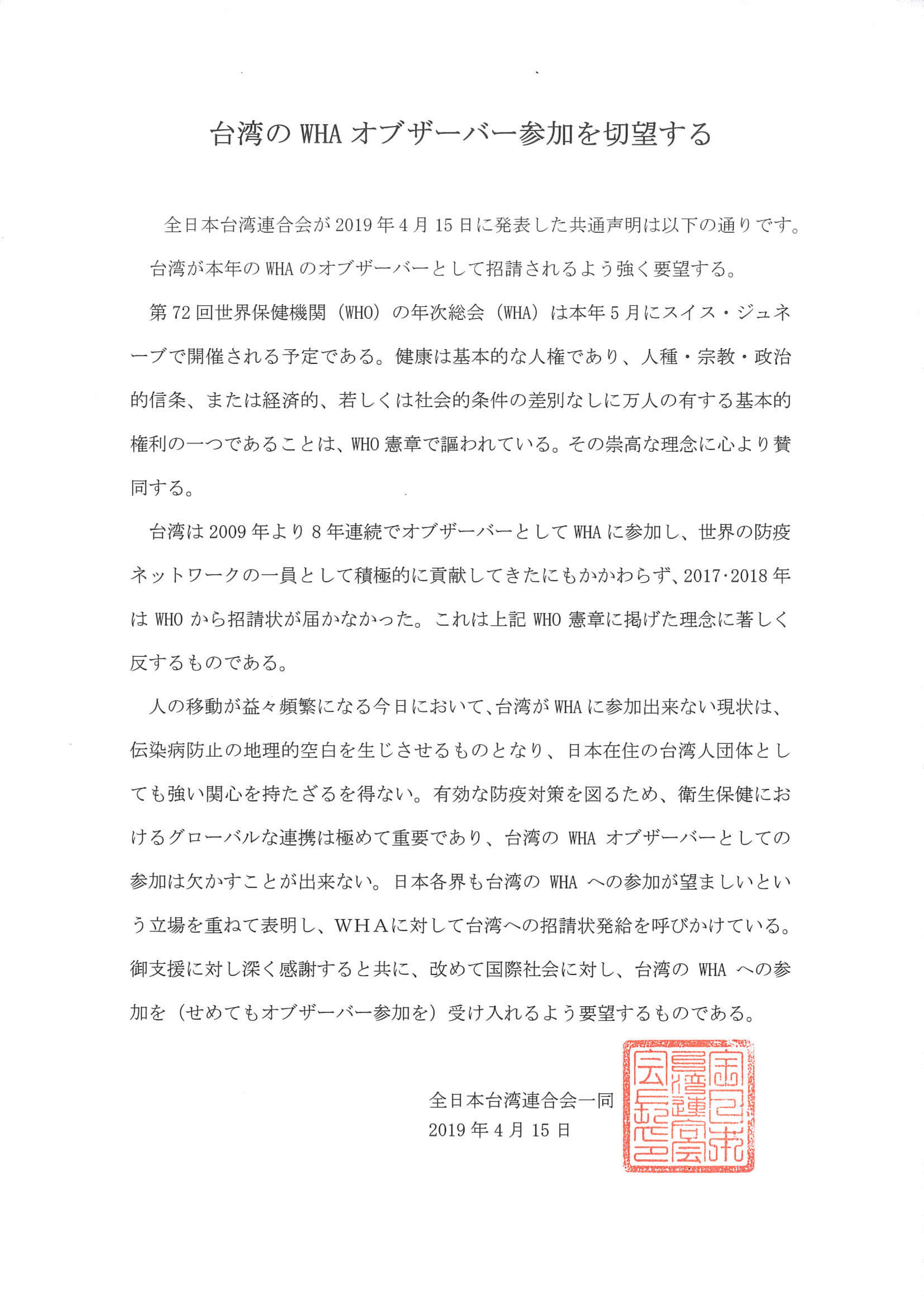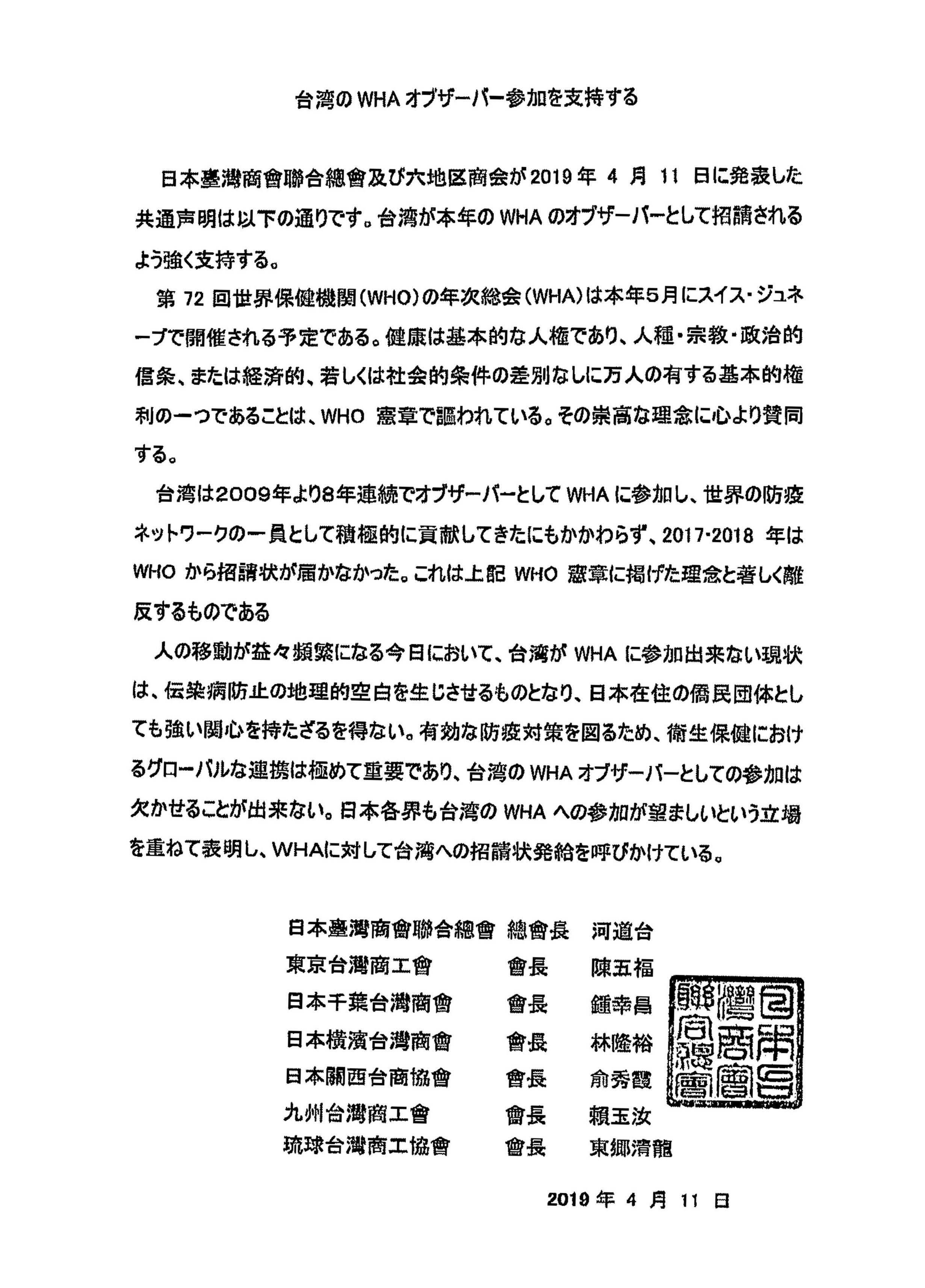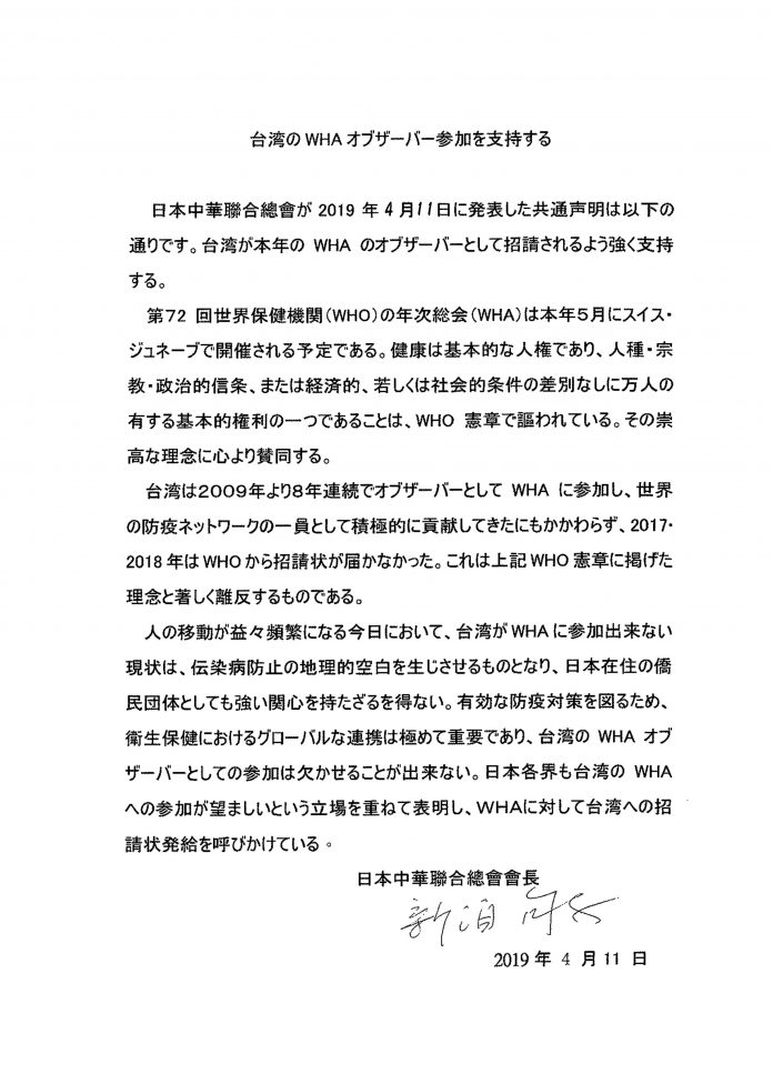 日本中華聯合總會、日本台湾商会聯合總會、全日本台灣連合会、中華民國留日東京華僑総会、日本台医人協会、日本台湾医師連合会、中華民國留日台湾同鄉会、在日台湾婦女会第72回WHA(世界保健機関年次総会)へのオブザーバーとしての台湾の参加を支持する声明文を発表した。