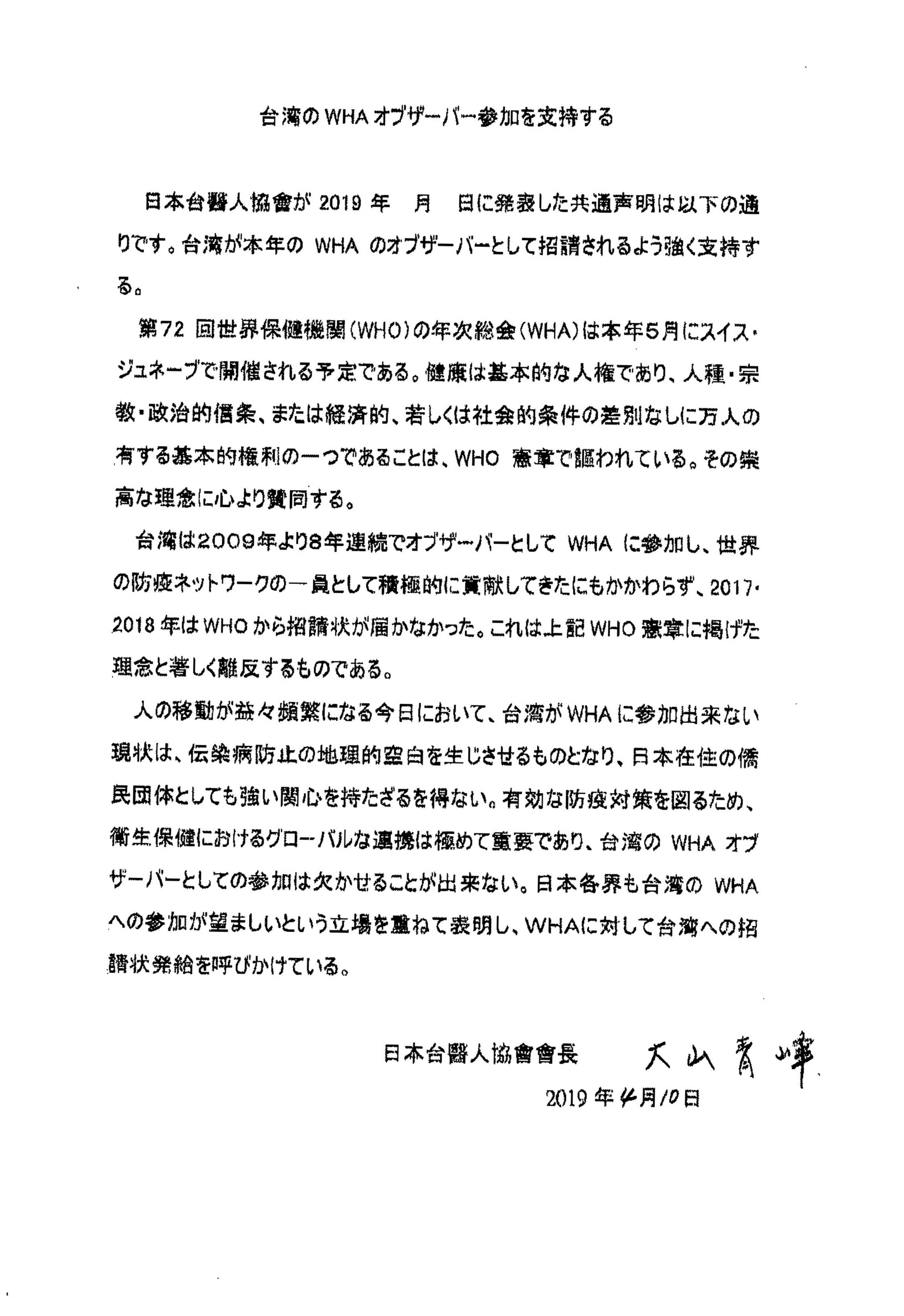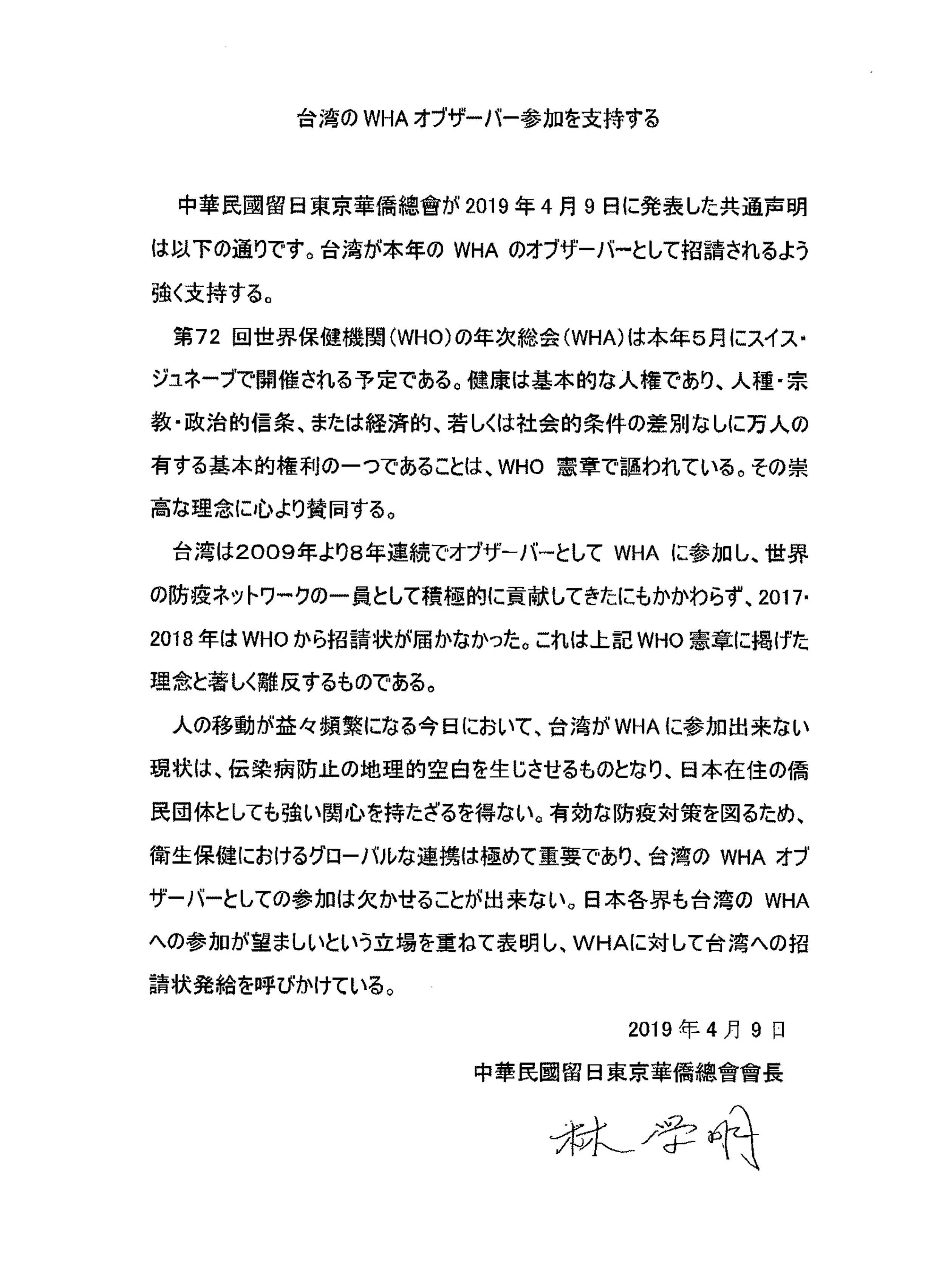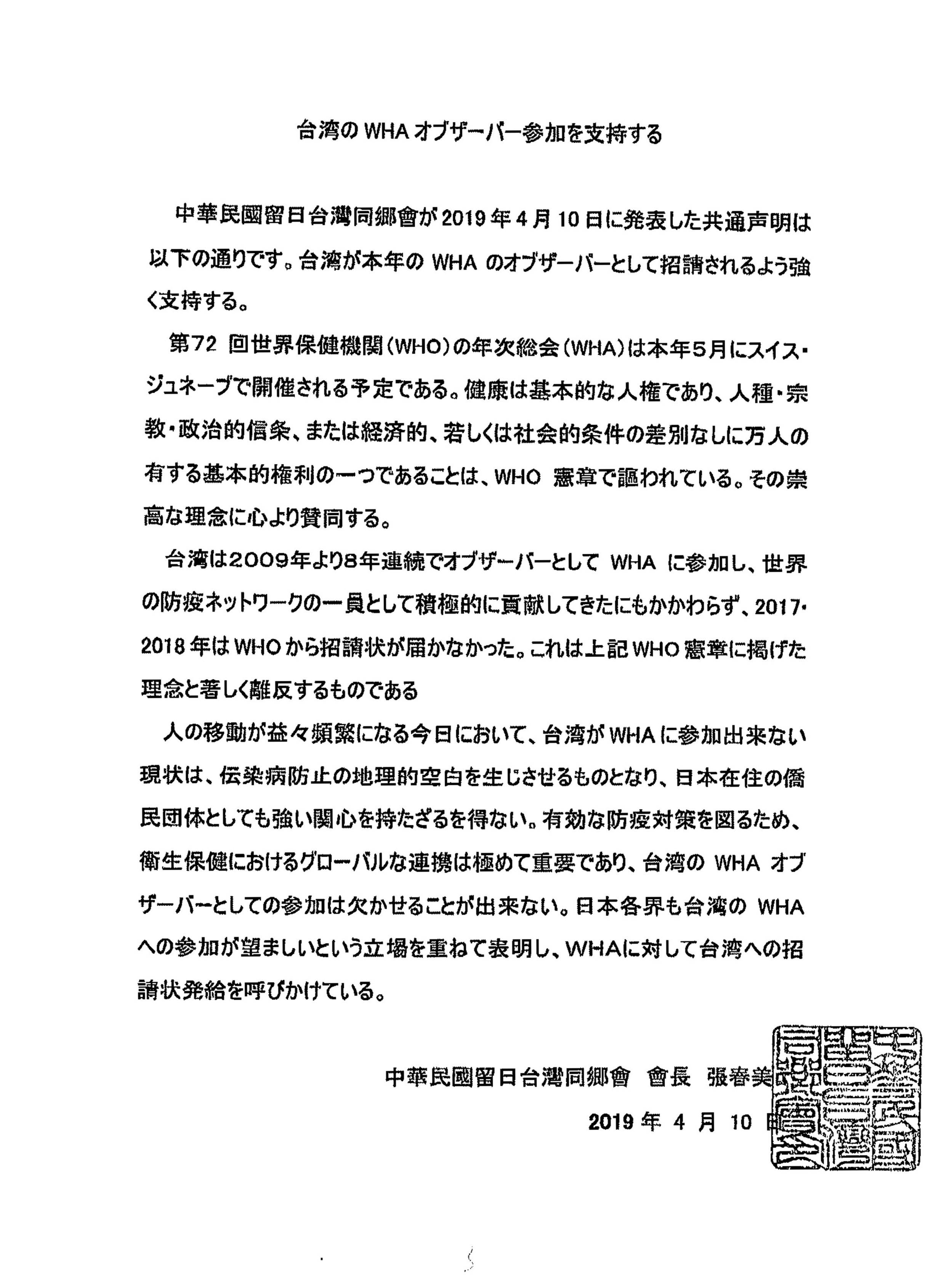 日本中華聯合總會、日本台湾商会聯合總會、全日本台灣連合会、中華民國留日東京華僑総会、日本台医人協会、日本台湾医師連合会、中華民國留日台湾同鄉会、在日台湾婦女会第72回WHA(世界保健機関年次総会)へのオブザーバーとしての台湾の参加を支持する声明文を発表した。