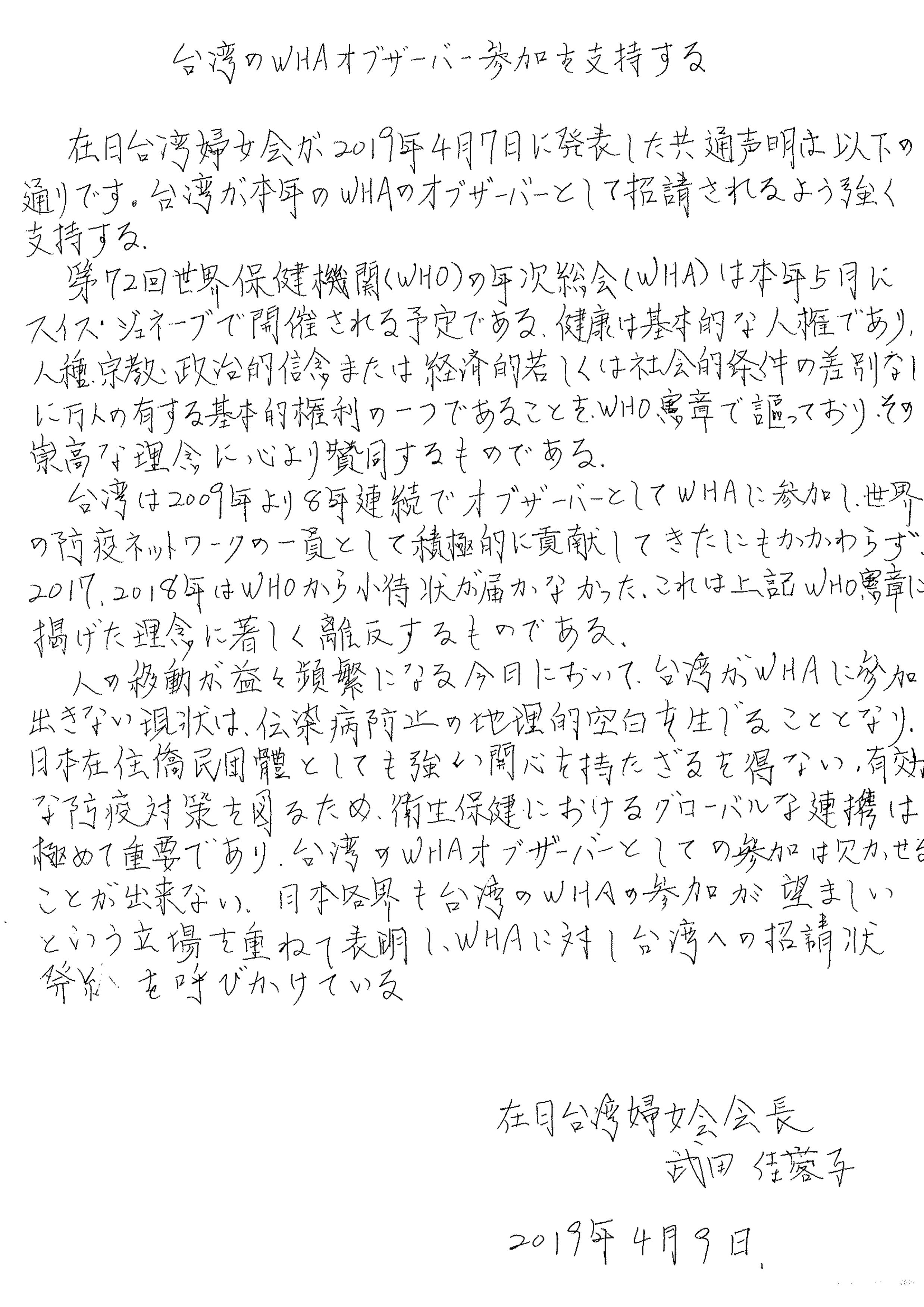 台湾は2009年より8年連続でオブザーバーとしてWHAに参加し、世界の防疫ネットワークの一員として積極的に貢献してきたにも関わらず、2017年、2018年WTO(世界保健機関)から招待状が届かなかった。これに対し声明文では、「WHO憲章に掲げた理念に著しく離反するものである」とし、台湾のWHAオブザーバーとしての参加への支持を、各界に伝えるため、今回の声明文発表に至った。