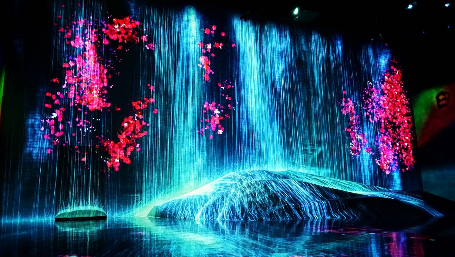 數位藝術博物館內各展區都有非常特色,沒有特別規劃參觀路線,讓遊客自由體驗藝術,像是「燈之森林」展區有類似台灣平溪施放天燈的美景,而只要遊客站到燈旁邊,燈光就會逐漸變亮,進而傳達到兩旁的燈,呈現出共振的感覺。另一座茶屋「EN TEA HOUSE-幻花亭」,可付費品茶體驗滿滿的禪意,茶杯端上桌時,杯中會因為燈光的照花朵,並無限盛開,符合「無界」的概念,讓遊客把「無界」的世界喝入腹中。
