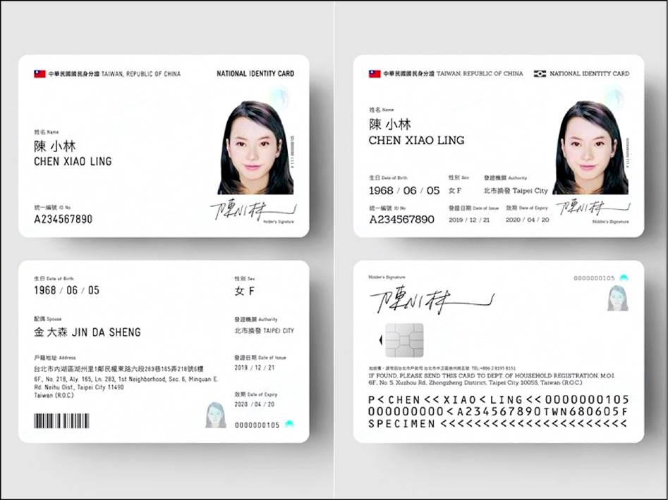 なお、カード正面には所持者の顔写真、氏名、統一編号(=IDナンバー)、生年月日が記載される。裏面には婚姻状態が記載される。カードに記載する個人情報を最小限に抑えることで、プライバシーを保護する。また、カード上方には中華民国(台湾)の国旗のロゴと、「中華民国国民身分証」と「REPUBLIC OF CHINA(TAIWAN) IDENTITY CARD」の文字が入る。