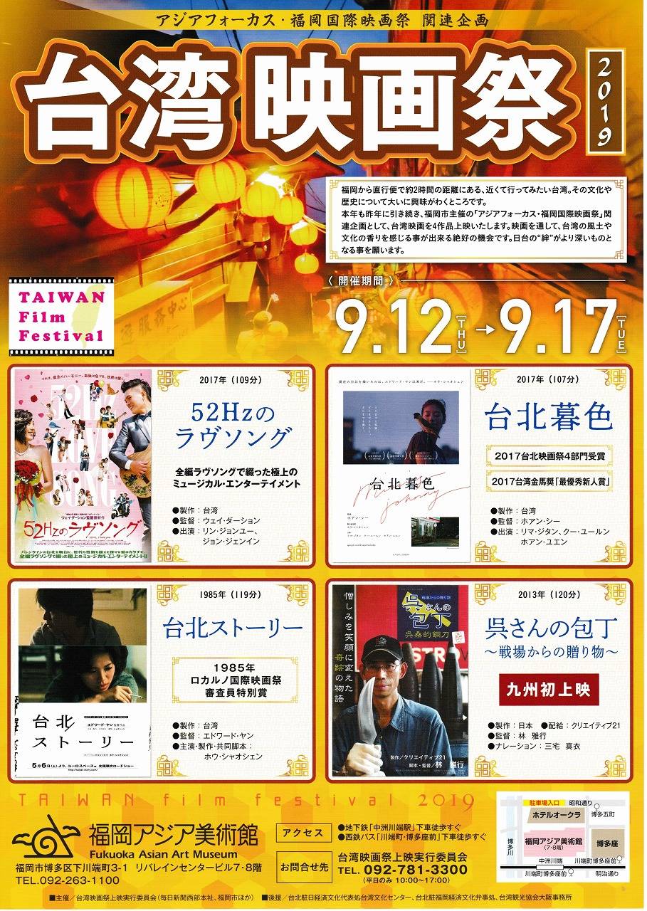 台湾映画祭上映実行委員会(毎日新聞西部本社、福岡市ほか)が主催し、台北駐日経済文化代表処台湾文化センター、台北駐福岡経済文化弁事処、台湾観光協会大阪事務所が後援する「台湾映画祭2019」が9月12日~17日の日程で、福岡アジア美術館8階「あじびホール」で開催された。