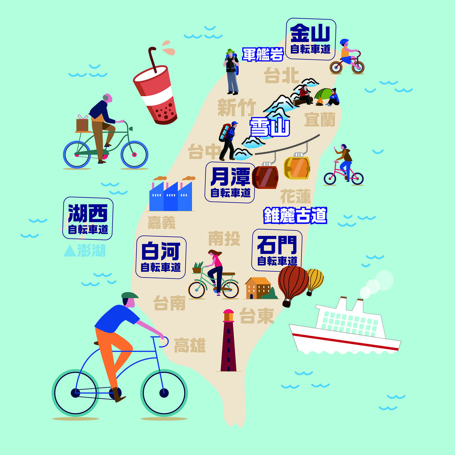 夏のシーサイドバカンスなら、金山萬里自転車道金山線がお薦め。海水浴場や極上のビーチでさまざまなウォータスポーツに挑戦できるほか、水尾漁港では海鮮、金山老街では本場の小吃が堪能できる。