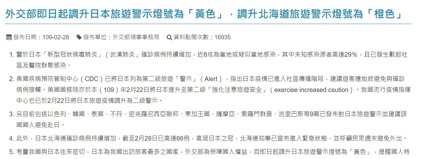外交部新聞稿指出,日本新型冠狀病毒肺炎確診病例持續增加,近8成為當地或疑似當地感染,其中未知感染源者高達29%,且已發生數起社區及醫院群聚感染。美國疾病預防管制中心(CDC)已將日本列為第二級旅遊「警示」(Alert),指出日本疫情已進入社區傳播階段,建議遊客應始終避免與確診病例接觸。美國國務院也於二月二十二日將日本提升至第二級「強化注意旅遊安全」。台灣流行疫情指揮中心也已於2月22日將日本旅遊疫情調升為二級警示。
