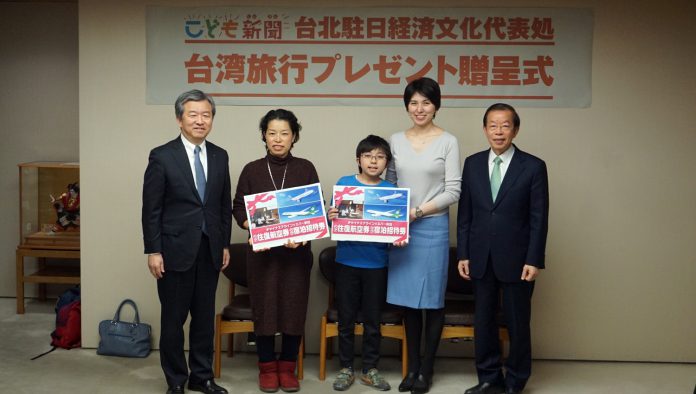【東京/採訪報導】日本每日新聞社每年都會舉辦台灣旅遊有獎徵答活動,會選出三名幸運兒贈送日本往返台灣的雙人機票及台北市飯店的住宿券,今年於二月十四日舉行頒獎典禮,駐日代表謝長廷也親自出席頒獎,小朋友前往台灣旅遊後,能更加認識台灣,並在回來後跟朋友們介紹台灣。