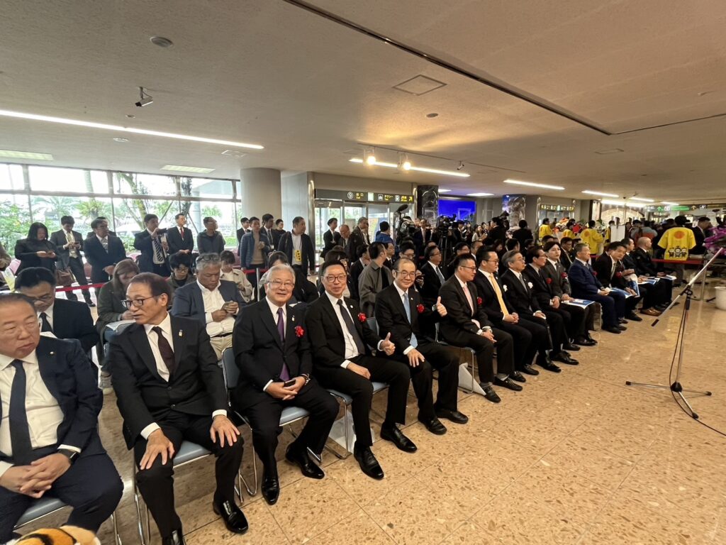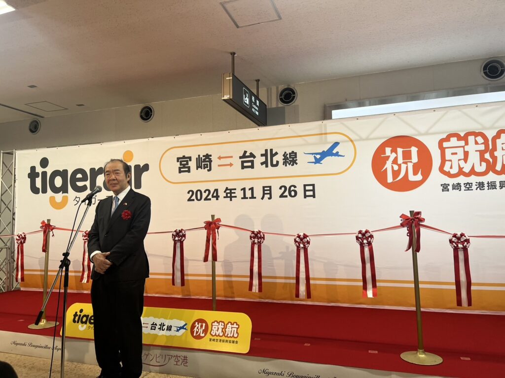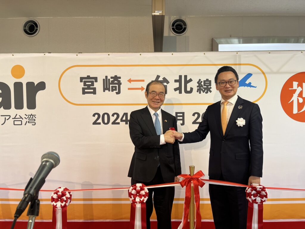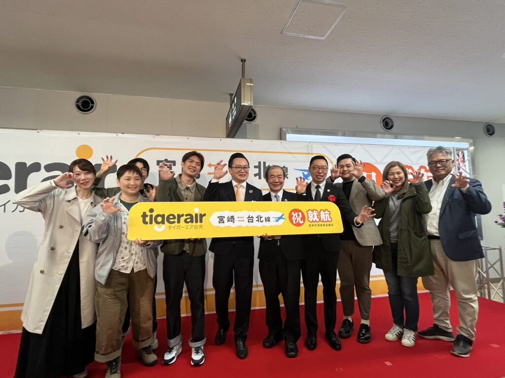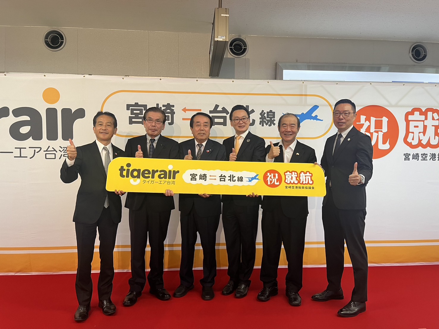 【宮崎/綜合報導】台灣虎航本年迎來開航10週年之際,宣布自11月26日開闢「台北ー宮崎」航線,繼福岡、佐賀之後直飛日本九州的第3個航點,也是台灣虎航飛航日本的第20個航點。為慶祝新航線運行,虎航於26日在宮崎空港舉辦首航儀式,虎航陳漢銘董事長、宮崎市清山知憲市長、宮崎縣日隈俊郎副知事、宮崎縣議會議長濱砂守、都城日台友好親善協會星原透會長、宮崎縣日台友好議員連盟聯絡會議會長丸山等地方政界、企業界、工商及台日親善團體重要人士共襄盛舉。