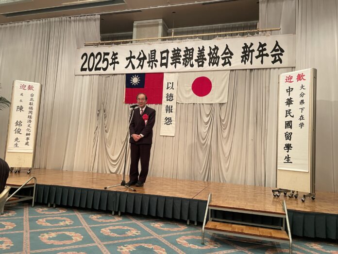 【大分/綜合報導】對台友好長達46年的「大分縣日華親善協會」2月1日在大分縣別府市Sun Valley Annex 飯店舉行盛大新年會,出席貴賓包含衛藤晟一参議員、古庄玄知参議員、白坂亜紀参議員、日本台灣親善協會會長衛藤征士郎前眾議院副議長、大分市足立信也市長、日田市椋野美智子市長、竹田市長土井昌弘、由布市相馬尊重市長、大分縣嶋幸議長、志村学議員、駐福岡辦事處陳銘俊處長等,涵蓋政界、學界、商界及11位台灣留學生,現場氣氛溫馨熱鬧。