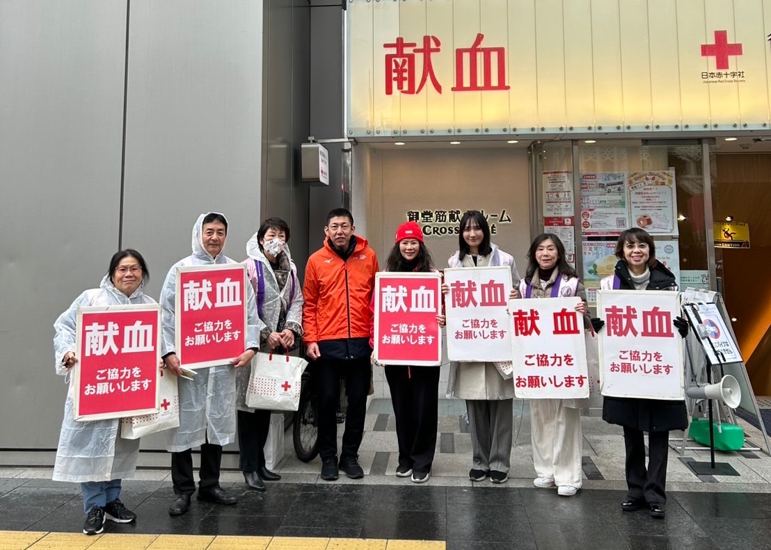 【大阪/採訪報導】不畏寒冬細雨,世界華人工商婦女企管協會日本關西分會與日本紅十字會御堂筋捐血站於3月16日共同舉辦捐血宣導活動。由會長林伊曼率領輔導會長劉雯玲、第一副會長中西美姬、川野榮子副會長等世華幹部,輪班在飄雨的大阪街頭呼籲往來民眾踴躍捐血。